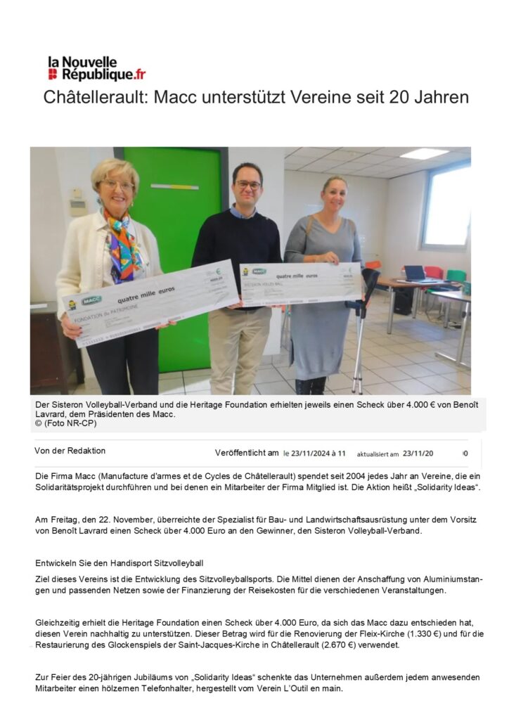Seit 2024 werden 32 Vereine vom MACC unterstützt: „AUTISME VIENNE, ECLAIR, Enfants du Rio, L’OUTIL EN MAINS Chauvigny (86) und ALBI (81), Les Virades de l’Espoir, FFK Vienne, Demain Antoigné, Social Center.“ und Kultur der Plaine d’Ozon, Santé sans Frontières, APEVO, Cavallino Rosso Club France, AMLO, Haus der Biene und Natur, MIRA Europa, Avec Arthur, API, Handi soins, Aptesian Volleyball Club, un geste pour un sourire, Ein Liebesroman, Taekwondo Valvert, Eulavie, Cie des archers de l’Envigné, Ferme de l’Espoir, Renaissance-Afrika, Korb de Haute Garonne, Teilen mit den Kindern der Welt, CS Dissay, Phoenixdarts, Captain’Nemo, Sisteron Volleyball «